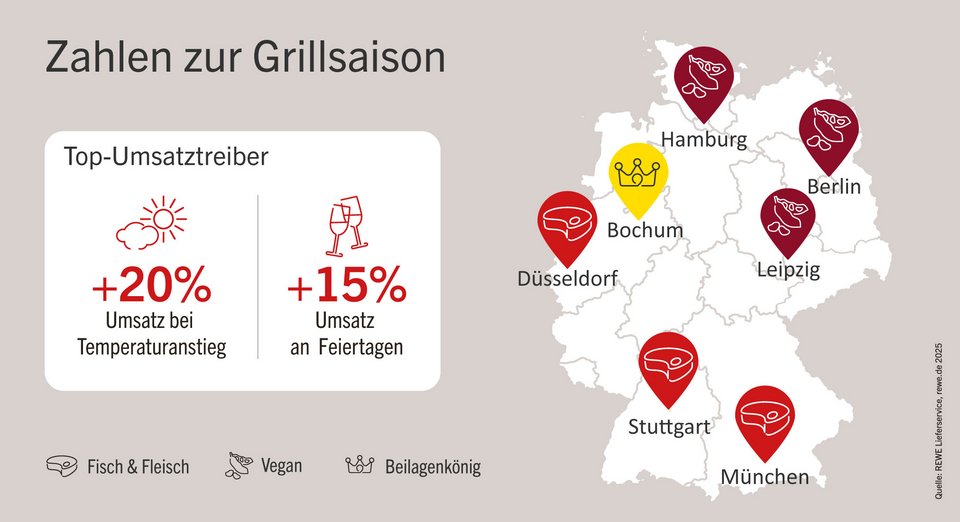 Das Kaufverhalten unterscheidet sich außerdem je nach Region. In München, Düsseldorf und Stuttgart wird weiterhin gerne klassisches Grillfleisch bestellt. In Berlin, Hamburg und Leipzig greifen die Kund:innen hingegen verstärkt zu Käse und veganen Alternativen.