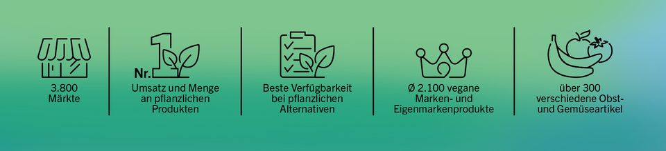REWE ist der führende Lebensmittelhändler für pflanzenbasierte Produkte in Deutschland. Das belegen aktuelle Studien. So kaufen Kund:innen nach Zahlen von Nielsen* in den mehr als 3.800 Märkten die meisten pflanzenbasierten Artikel ein. Laut der repräsentativen Untersuchung ist REWE sowohl nach Umsatz als auch nach Menge die Nummer eins für pflanzliche Produkte. Die ProVeg-Preisstudie* bescheinigt REWE zudem die beste Verfügbarkeit pflanzlicher Alternativen. Mit durchschnittlich 2.100 veganen Marken- und Eigenmarkenprodukten und mehr als 300 verschiedenen Obst- und Gemüseartikeln je Markt bietet REWE eine breite Vielfalt für pflanzenbasierte Ernährung.