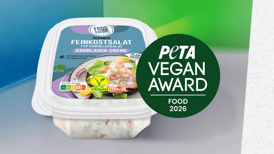Auch PENNY wird 2026 mit einem PETA Vegan Award ausgezeichnet – und zwar für ein herausragendes Einzelprodukt. Der Feinkostsalat „Typ Garnelensalat ‚Knoblauch Creme‘“ der Eigenmarke Food For Future erhält den Award in der Kategorie „Beste Fischalternative“.