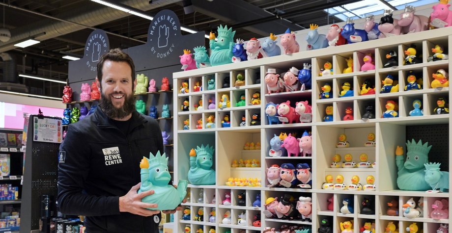 Zwischen Weinregalen aus Sizilien und der Pfalz, einem Regal voller Quietscheenten und Winkekatzen, einem Wollregal, das so liebevoll sortiert ist, dass es fast wie eine kleine Boutique wirkt, und einer eigens entwickelten Self-Scan-Kasse empfängt Johannes Fieber die Kundschaft in seinem 5.000 Quadratmeter großen Markt im Mannheimer Lilienthal-Center. Mit der Freiheitsstatuen-Ente in der Hand lächelt er in die Kamera. Ein Symbol für seine Reise: von Mainz über Italien, Schweden und die USA zurück nach Deutschland – und hinein in die Selbstständigkeit als REWE-Kaufmann.