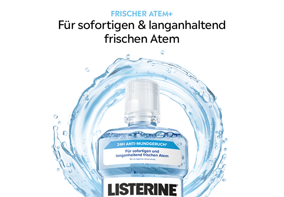 Auch fortgeschrittener Mundgeruch gehört zu den Nr. 3 Mundpflegebedenken5, aktuell leiden circa 25 % der deutschen Bevölkerung an Halitosis (Mundgeruch)6. Während zurzeit kaum Halitosis-Mundspülungen existieren, steigt die Nachfrage immer mehr7. Damit weist das Subsegment die zweit stärkste Entwicklung auf und birgt unerschlossenes Potenzial7. Die zweite Neuheit von LISTERINE®, LISTERINE® Professional Frischer Atem+, bietet bei 2-mal täglicher Anwendung 24 h Anti-Mundgeruch. Die innovative 3-fach-Wirkformel aus ätherischen Ölen, Zink und einer geruchsneutralisierenden Technologie absorbiert und neutralisiert Geruchsmoleküle, und beugt so hartnäckigem Mundgeruch vor. Auch LISTERINE® Professional Frischer Atem+ enthält keinen Alkohol und hat einen milden Geschmack.