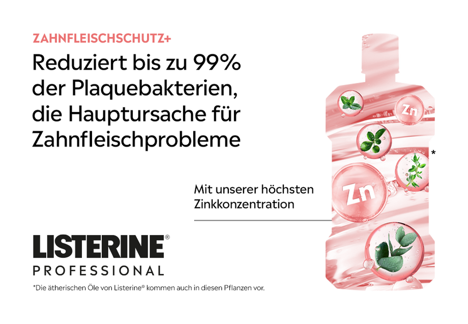 Marktrecherche ergab, dass die Bekämpfung von Zahnfleischproblemen in Deutschland zu den wichtigsten Kaufkriterien für ein Mundpflegeprodukt gehört2. Die Nachfrage nach Produkten zur Lösung und Vorbeugung von Zahnfleischproblemen wächst daher kontinuierlich3. Mit der Einführung von LISTERINE® Professional Zahnfleischschutz+ bietet die Marke eine Lösung und schafft effektiven Zahnfleischschutz in nur 1 Woche4. Dank der Formel mit ätherischen Ölen und der höchsten Zinkkonzentration im Portfolio können bis zu 99 % der Plaquebakterien reduziert werden, welche als Hauptursache für Zahnfleischbluten und -entzündungen gelten. Zudem enthält die Variante keinen Alkohol und hat einen milden Geschmack. Damit bedient LISTERINE® die wachsende Nachfrage nach milden, alkoholfreien Produkten und spricht ein breites Spektrum von Konsument:innen an.
