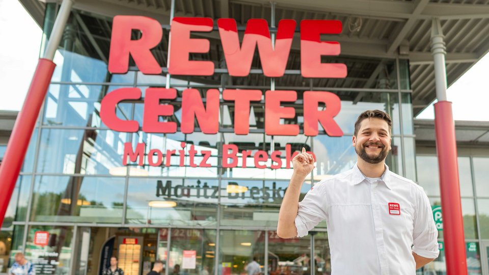 Wenn Moritz Breske eine Runde durch sein REWE Center am Winterbeker Weg dreht, ist er ein Weilchen unterwegs. Das liegt natürlich an der schieren Dimension, einerseits. 7.000 Quadratmeter misst die Verkaufsfläche, da sind´s von der Theke zur Kasse schon ein paar Meter. Der andere Grund: Auf der Strecke begegnet der Kaufmann der einen und anderen seiner Mitarbeitenden und Kund:innen, mit denen er gerne ein paar Worte wechselt. Besonders stolz ist Moritz Breske, wenn er seiner Kundschaft behilflich sein kann. Einmal, so erzählt er, traf er mitten im Markt eine Kundin, die ihre Arme voll mit Ware hatte. Gefragt, ob sie einen Einkaufskorb bräuchte, entgegnete die Frau: „Ja, gerne. Eigentlich wollte ich ja gar nicht so viel kaufen.“ In diesen Momenten weiß der Händler: „Ich habe einen guten Job gemacht. Dann geht mir als Kaufmann das Herz auf.“