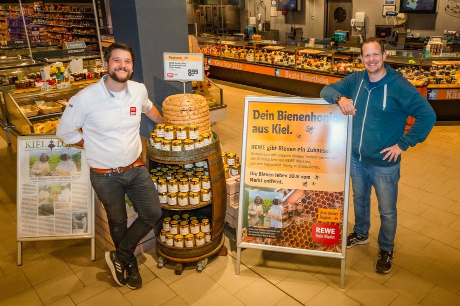 Von international über regional bs ganz lokal: Dank der großen Verkaufsfläche sucht das Sortiment seinesgleichen. Eines der Highlights ist der hauseigene Honig, den die fleißigen Bienen von Imker Philipp Sosnowski (rechts) auf dem Dach des REWE Centers produzieren. Foto ©Moritz Breske