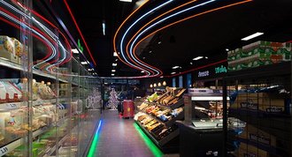 Ein einzigartiges PENNY-LEUCHTturmprojekt erstrahlt in München: In der Filiale scheinen bunte LED-Strahlen von der schwarzen Decke und leiten die Kunden durch den Markt. one zeigt die Design-Filiale in Bildern.