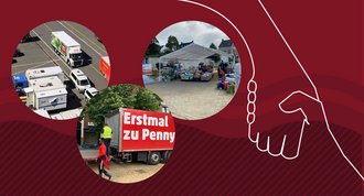 Angesichts der Flutkatastrophe in Nordrhein-Westfalen, Rheinland-Pfalz, Bayern und Sachsen leistet die REWE Group kurzfristig und unbürokratisch Hilfe: REWE, PENNY und Toom unterstützen vor Ort mit Sachspenden.