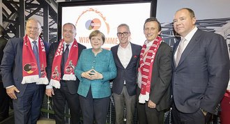 Angela Merkel sah am Dienstag (4.4.) beim Heimsieg des 1. FC Köln gegen Eintracht Frankfurt die FC-Kicker nicht mit gewohntem REWE-Schriftzug auf der Brust. Denn zugunsten des Integrationsprojekts „Wir zusammen“ verzichtete REWE auf den prominenten Werbeplatz. Das Engagement beeindruckte auch die Bundeskanzlerin.