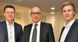 Es kommt nicht alle Tage vor, dass ein Vorstand zwei dualen Studenten zum Bachelor gratuliert: Danny Fleer und Tobias Mohr haben in ihren Fächern Bestnoten erzielt – Grund genug für Glückwünsche von REWE Group-Vorstand Frank Wiemer.