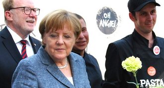 Bundeskanzlerin Angela Merkel trifft auf „Oh Angie!“ und weinfreunde.de: Beim Sommerfest des CDU/CSU-Parlamentskreises Mittelstand ließ sich die Kanzlerin an den REWE Group-Ständen die Leckereien schmecken.