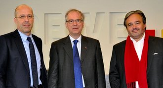 Zum Austausch über politische Themen mit Alain Caparros und Jan Kunath war Bundestagsabgeordneter Heribert Hirte bei der REWE Group. Diskutiert wurden aktuelle Handelsthemen – und die Rolle Deutschlands in der Flüchtlingspolitik.