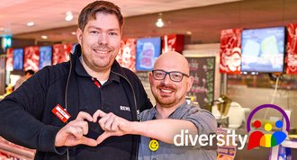 Alle elf Minuten verliebt sich ein Single mit... REWE? Wenn es nach Matthias und Dominik geht, schon. Das frisch vermählte Paar lernte sich am Arbeitsplatz kennen und lieben.