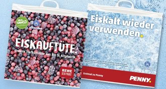REWE und PENNY führen nachhaltigere Tiefkühltragetaschen ein. Diese werden aus ressourcenschonendem Recyclingmaterial hergestellt und erfüllen die Kriterien für das Nachhaltigkeitslabel „Blauer Engel“.